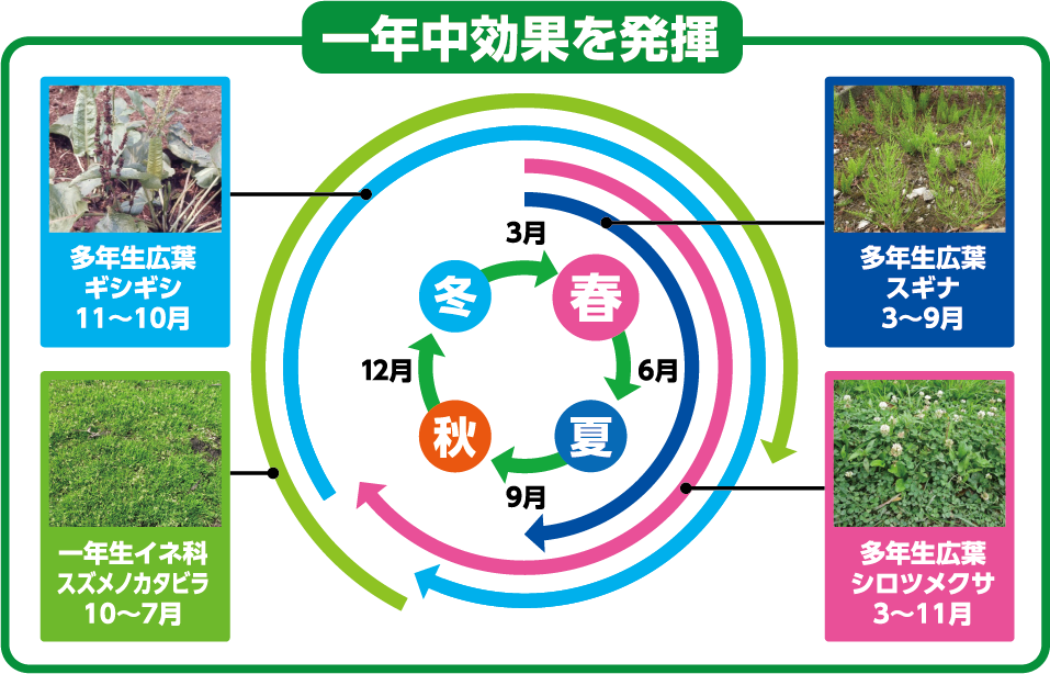 ●土壌条件、気象条件(夏期乾燥時等)によっては、効果にむらが生じる場合があります。