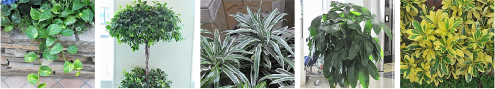 ポトス、ドラセナ、ベンジャミン、シェフレラ(カポック)、ディフェンバキア、ゴムノキ、アイビー、パキラ、ヤシ類、アンスリウム、スパティフィラムなど