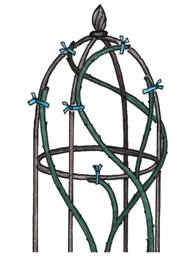 4.オベリスクの頂部は、枝があまり飛び出さないようにして、細めのつるを丸くまとめるように曲げるときれいに仕上がる。