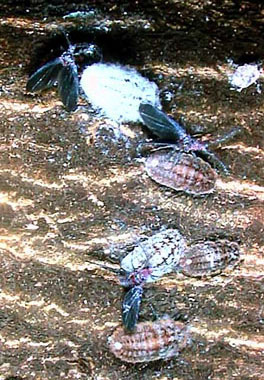 カイガラムシといっても大きさや形などは様々です。名前が付いている種類だけでも400種以上おり、実際はその倍くらい存在すると推測されています。カイガラムシを大別すると、成虫になった時に脚が退化して葉や枝に固着する種類と成虫になっても歩き回る種類がいます。前者には丸い偏平な殻を持ったマルカイガラムシ類、牡蛎の形をした殻を持ったカキカイガラムシ類、お椀のように丸く盛り上がったロウムシ類などがいます。後者は殻がなく体表が白い粉状や綿状の分泌物に覆われている種類でフクロカイガラムシ類やコナカイガラムシ類(分泌物を取り除くとワラジムシのような虫がいます)などがいます。アブラムシと比べると繁殖性が悪く、よく繁殖するコナカイガラムシでも年に数回、バラシロカイガラムシで年に2~3回、ロウムシ類では1回の繁殖です。雄がいなくて雌だけで繁殖する種類もいますが、多くはコバエのような翅のある雄がおり、交尾して産卵します。雌成虫は繰り返し産卵せず、産卵後すぐに死ぬ種類もいます。