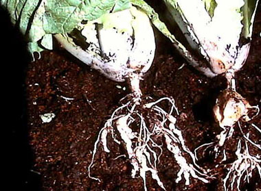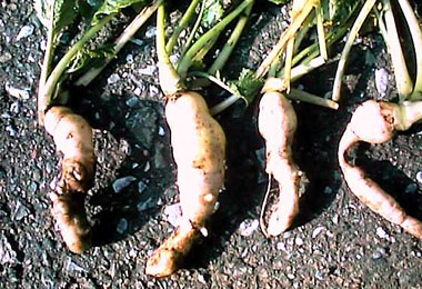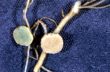 その1:【根こぶ病】:【根りゅう菌】:根にコブがついていれば必ずネコブセンチュウが寄生したとは限りません。似たような症状に「根こぶ病」や「根りゅう菌」があります。これらはネコブセンチュウと同じように根にコブを作ります。「根こぶ病」は主にアブラナ科植物(ダイコンやハクサイ)を連作すると発生しやすくなります。一方、「根りゅう菌」はマメ科植物に寄生し、空気中のチッ素を固定して植物に供給する有益な菌です。
