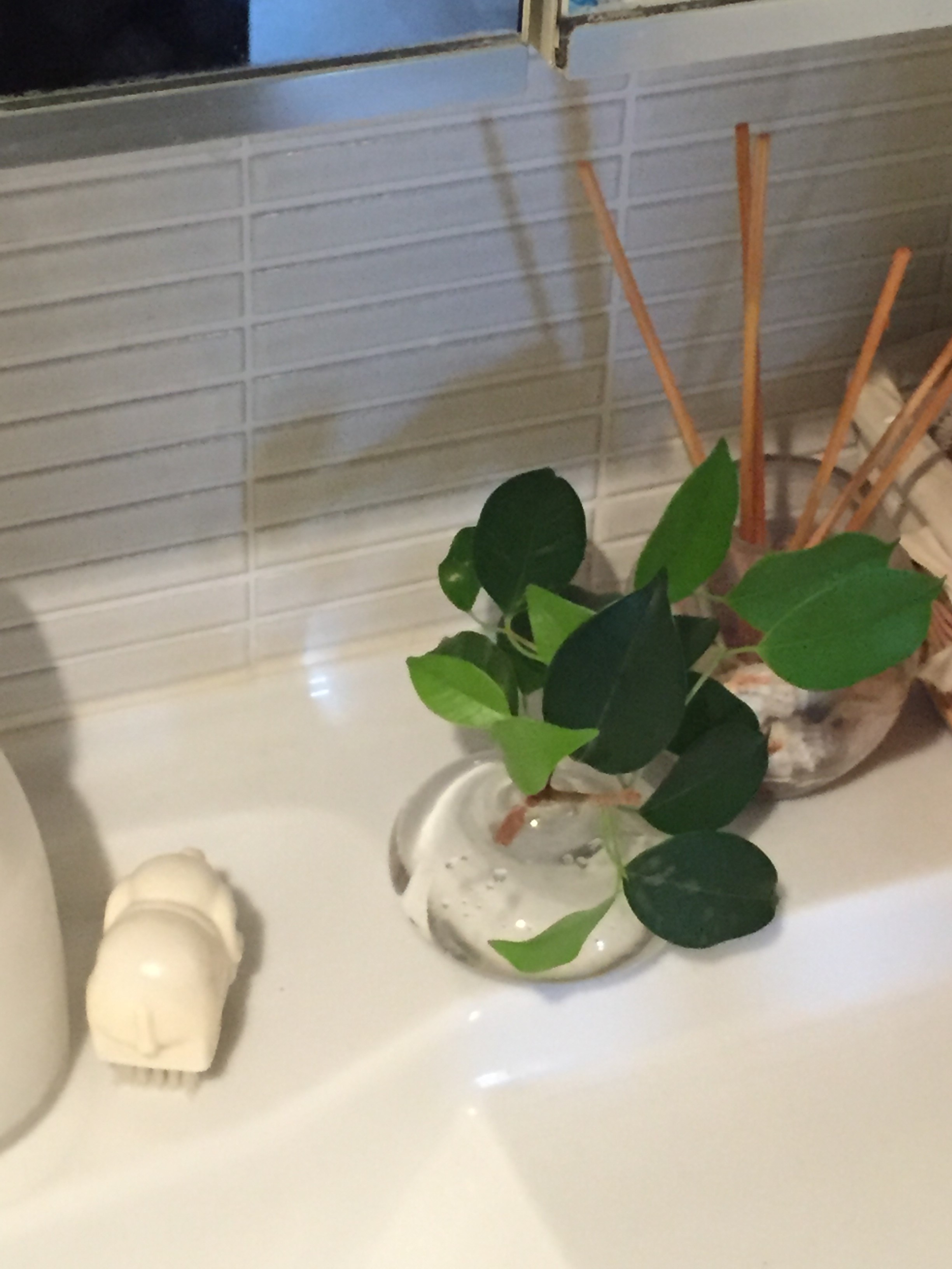 切ったベンジャミンの枝先は、捨てないで一輪挿しへ。