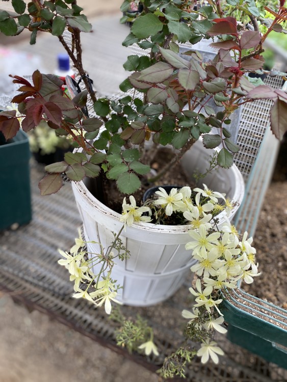 大丈夫だよ。このクレマチスはね、バラには絡めないでグランドカバーとして使うんだよ。