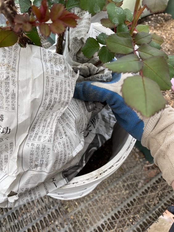 バラを鉢から抜く時、トゲが痛そうだったら、株元を新聞紙などで包んでおくと楽よ!そして、接木の部分は深植えせず地表に出しておいてね!
