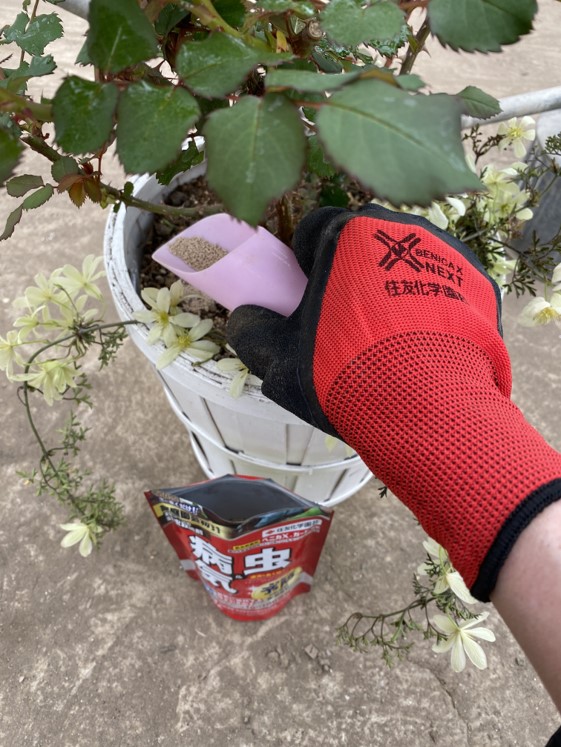 そしたら、仕上げにね、粒タイプの殺虫殺菌剤「ベニカXガード粒剤」を土の上にパラパラってまくと良いよ!