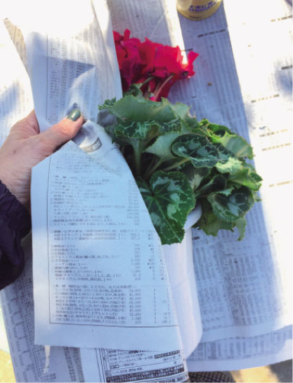 日陰に置いて新聞紙で乾きにくくしてね、そのぶんシクラメンが葉っぱの裏や根からゆっくりたっぷりお水が吸えるようにしてあげてるんだよ。